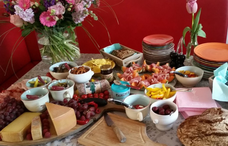 Im letzten Jahr hatten wir ein altes Holzbrett gekauft, auf dem früher Brot gebacken wurde. Dieses bestückte ich mit verschiedenen Käse- und Wurstspezialitäten, Melone mit Parmaschinken, Weintrauben, kleinen Honigtomaten, Antipasti-Gemüse und vielem mehr. Dazu reichte ich französische Butter und eine Auswahl an verschiedenen Broten des Traditionsbäckers Tollkötter aus Münster.