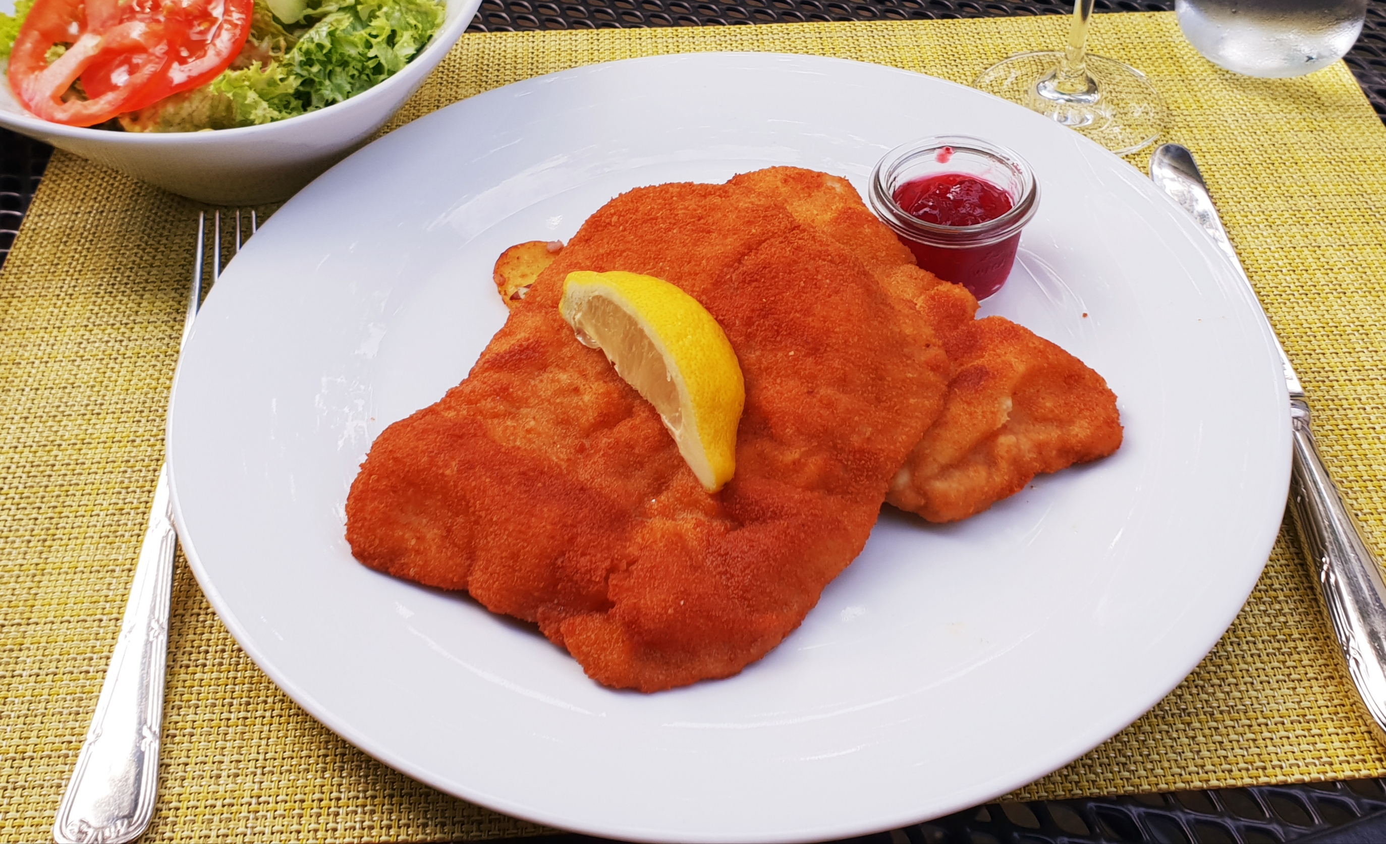 Wir konnten das perfekte Wiener Schnitzel mit Bratkartoffeln,Salat und Preiselbeeren draußen auf der lauschigen Terrasse genießen.