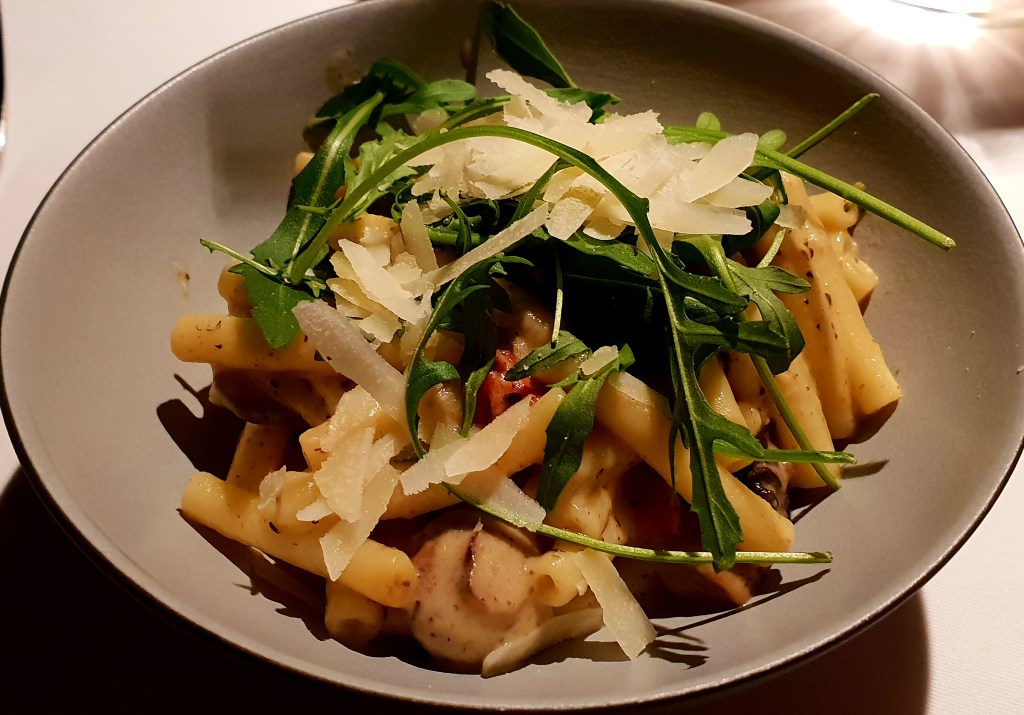 MAKKARONI mit Trüffelrahm, Waldpilzen und geschmolzenen Tomaten