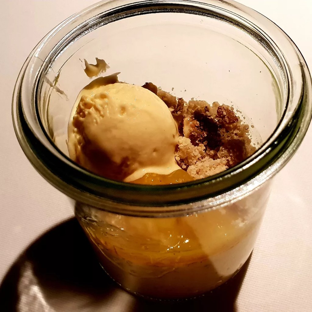 GEBRANNTE VANILLECREME mit Safranbirne und Aprikosen Sauerrahmeis