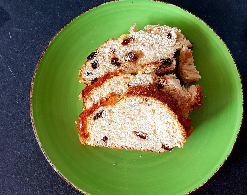 Inzwischen für den Stuten Rosinen waschen, in einem Sieb gut abtropfen lassen. Teig halbieren. Unter eine Hälfte die Rosinen kneten. Rosinenteig zu drei langen Rolle formen. Flechten und auf ein Backblech legen.Nochmals mind. 50 Minuten an einem warmen Ort gehen lassen.