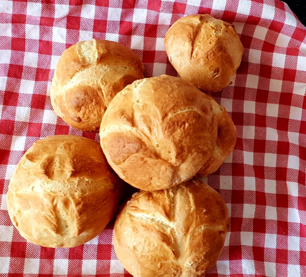 Den Teig in eine große Schüssel füllen und mit etwas Mehl bestäuben und 30 Minuten an einem warmen Ort gehen lassen. In 5 gleichgroße Stücke teilen. Den Backofen auf 220 Grad Ober-/Unterhitze vorheizen.