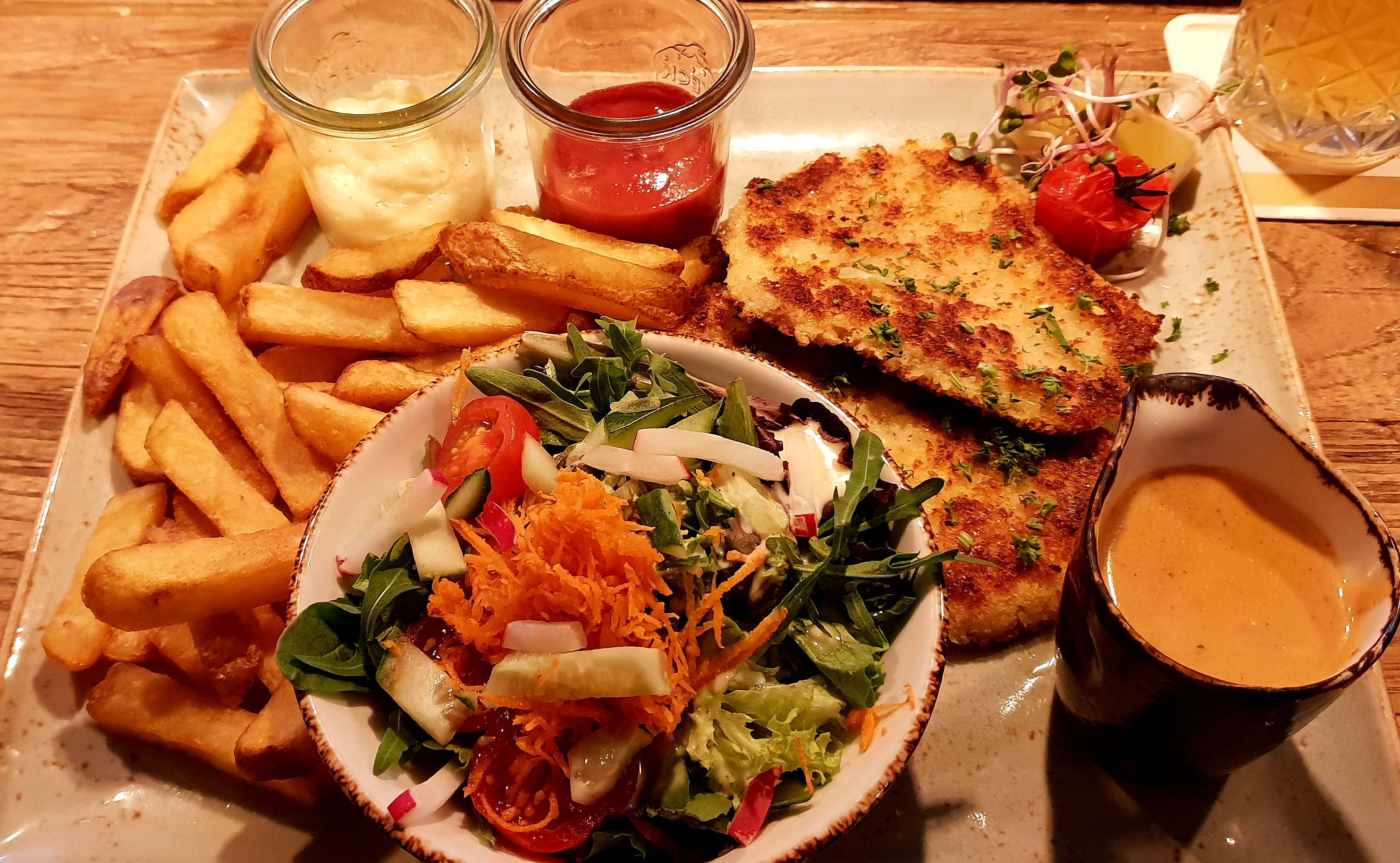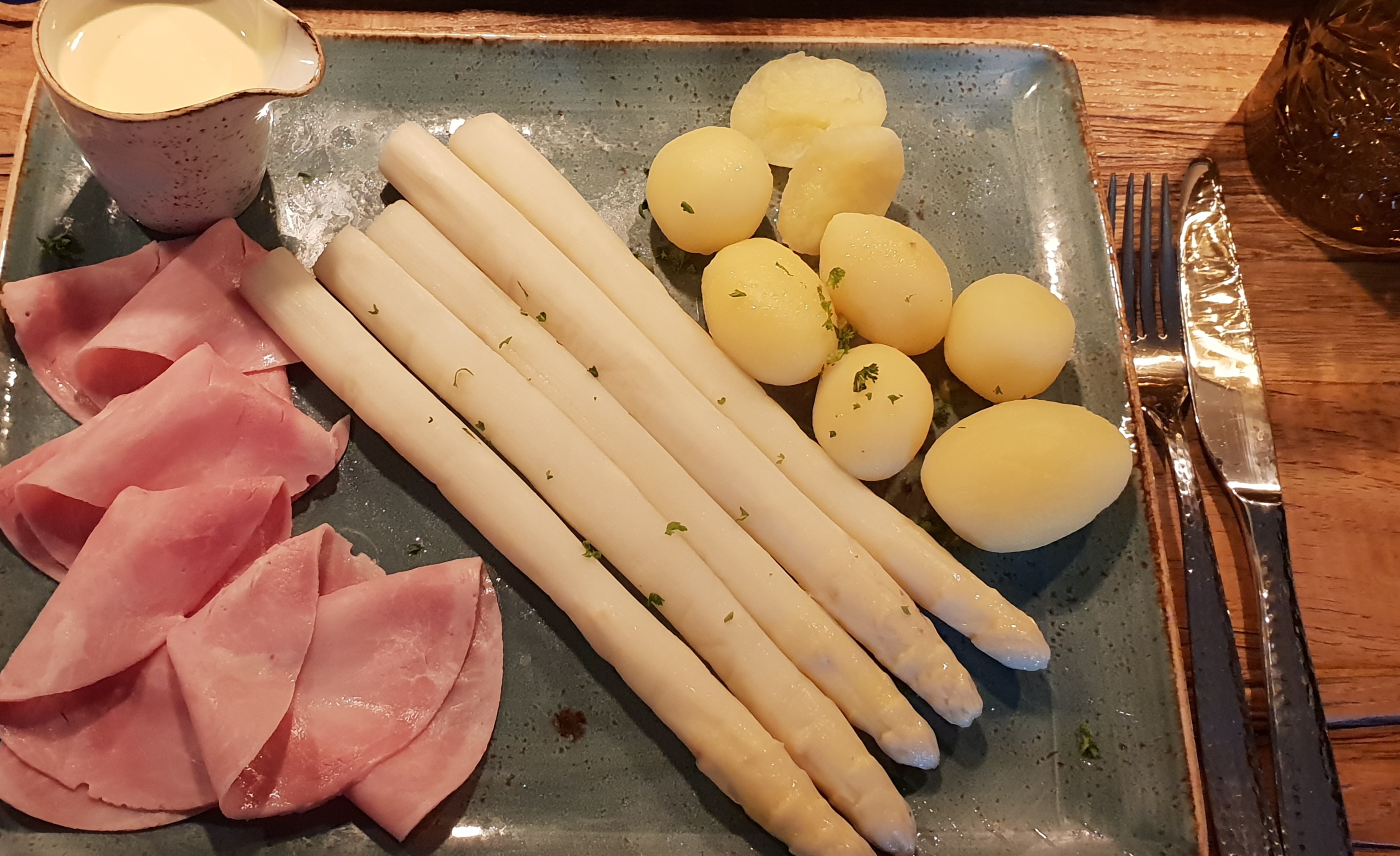 Wir begannen als Vorspeise mit einer köstlichen Spargelcremesuppe. Als Hauptgänge wählten wir Spargel mit gekochtem Schinken und für die Kinder gab es Schnitzel mit Kartoffelstäbchen und Salat.
