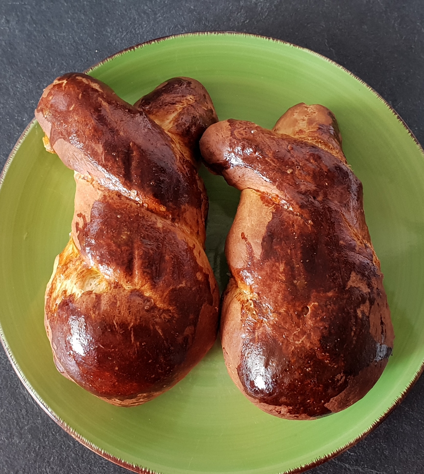 Backbleche nacheinander in den heißen Ofen schieben. Hasen jeweils ca. 20 Minuten backen. Herausnehmen, auskühlen lassen. Hefezopfteig auf dem Backblech mit Rest Eiermilch bestreichen. Im Ofen bei gleicher Temperatur ca. 25 Minuten backen.