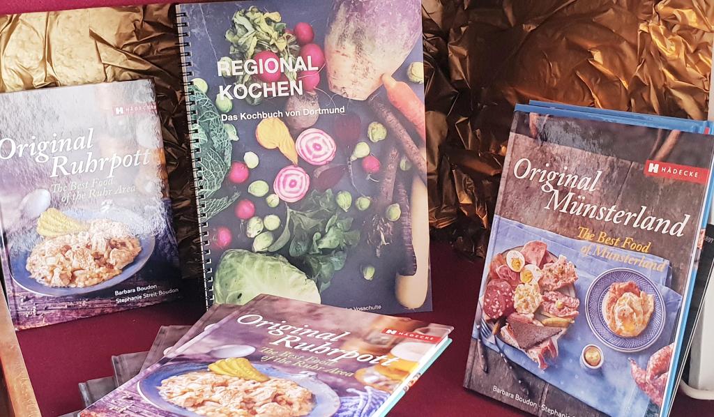 Mit dabei ist natürlich auch unser Ruhrpott-Kochbuch! Zu dem Buch oder einzeln gibt es Grubentücher, Schürzen und auch handgefertigte Pralinen, Bier, Korn und Liköre alt eingesessener Dortmunder Familienbetriebe.